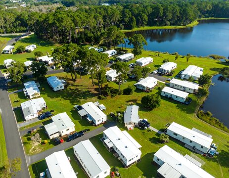 Mobile home park, age-restricted (55+) community in small beach town in California. Architecture, street view