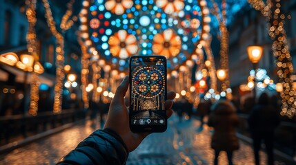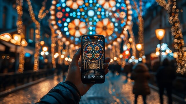 Tapping tablet at night with warm bokeh lights urban evening tech lifestyle and intimacy
