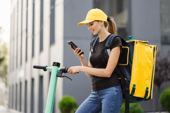 Low-angle view of delivery woman with thermo backpack using navigation app on mobile phone. Female courier looking for client address using smartphone riding order on electric scooter.