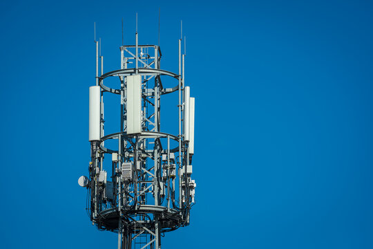 Telecommunication tower of 4G and 5G cellular. Base Station or Base Transceiver Station. Wireless Communication Antenna Transmitter. Telecommunication tower with antennas isolated on white background.