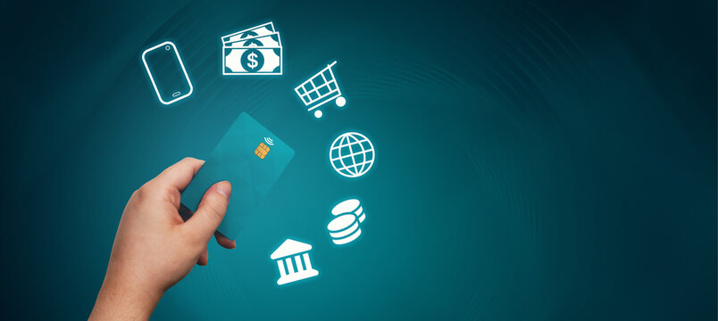 Header of female hand showing credit card over dark green background with VR interface of multiple options online. Business app. Shopping online. Secure purchase. Digital payments. Online banking.