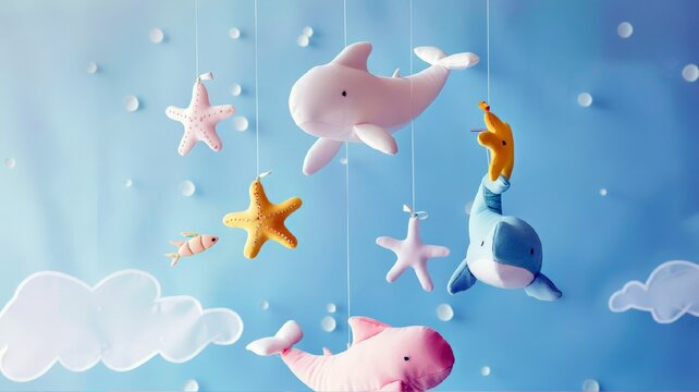Cute baby crib mobile on blue  background. hanging module for a baby cot with textile  stars and marine animals.