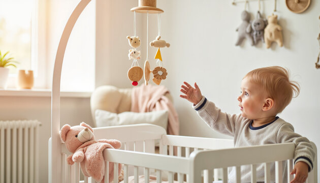 Curious baby reaching for mobile in serene nursery, joyful discovery