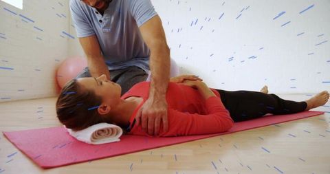 Physiotherapist kneeling assisting client lying on mat during gentle chest mobilization
