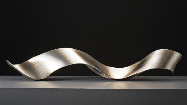 Abstract metallic Mobius strip sculpture with a brushed finish resting on a surface with a dark background