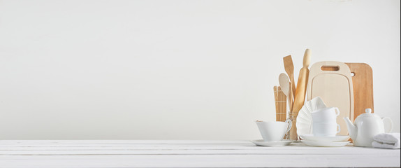 Blank space for kitchen wide banner concept. mockup with spoon, teapot, cups, rolling pin, bowls on table