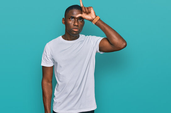 Young african american man wearing casual white t shirt making fun of people with fingers on forehead doing loser gesture mocking and insulting.