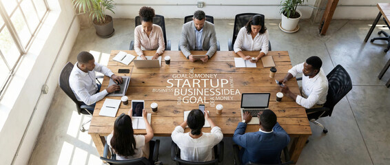 Group gathers around a table to share business plans, created AI