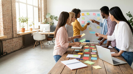 Collaborating team members annotating app mockups in meeting room, with smartphone highlighters