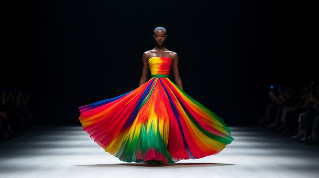 Model in a vibrant avant-garde dress walking down the runway at New York Fashion Week, cameras flashing