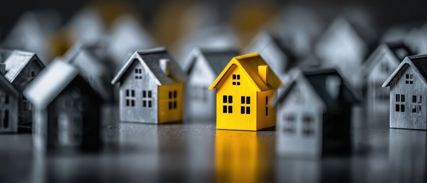 The Yellow House Standing Prominently Among Gray Model Homes on Reflective Surface