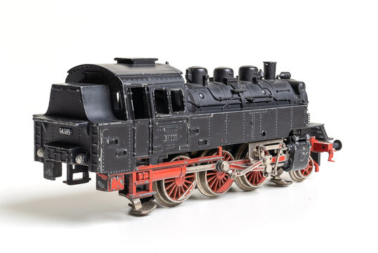 black and white steam locomotive with a prominent headlight is pulling brown passenger carriages