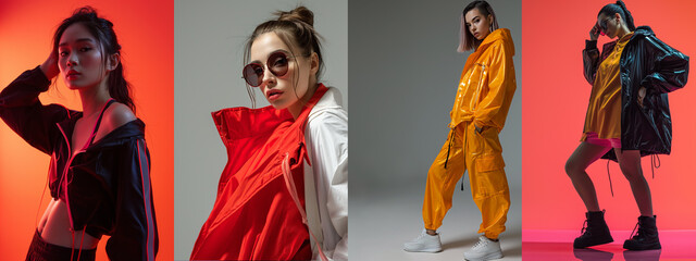 Women in High Fashion Sporty Outfits with Striking Poses. Edgy and Bold.