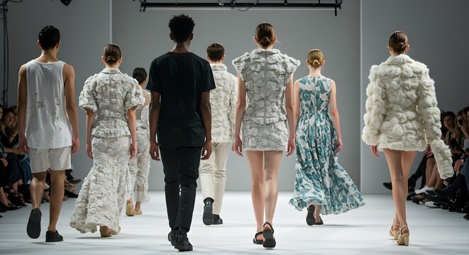 Ai-generated fashion models walking runway in iridescent pink blazers