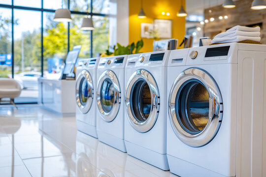 Row of modern washing machines in a brightly lit appliance showroom with large windows and contemporary decor, showcasing household technology and innovation.
