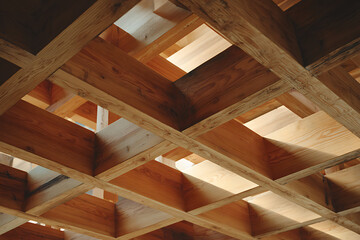Sunlit wooden structure under construction showcasing an architectural design and craftsmanship with geometrical shapes