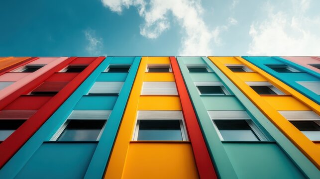 A captivating view of a building's facade adorned with vertical stripes in vibrant hues, demonstrating a modern architectural approach to color applications.