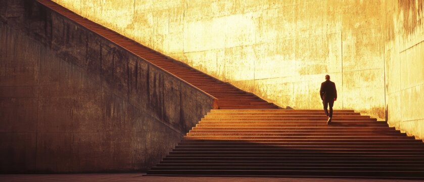 A lone figure descends sunlit stairs, casting long shadows that blend with the warm glow of golden walls.