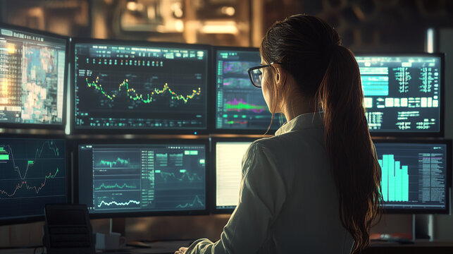 Woman Analyst Working with Financial Data on Multiple Monitors