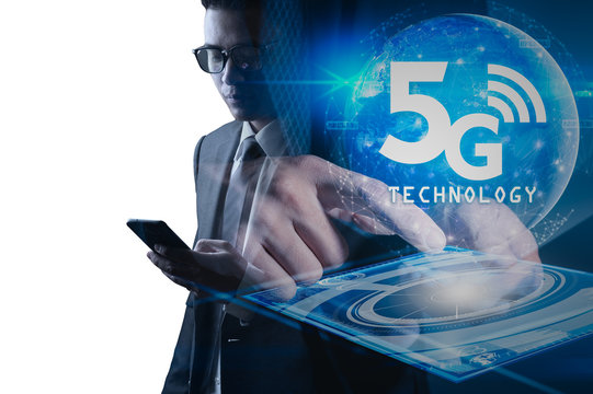 The double exposure image of the businessman using a smartphone overlay with 5G holographic image. The concept of 5G, future, business, city life and internet of things.