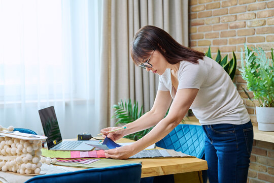 Mature woman interior designer working at her desk with fabric samples, laptop