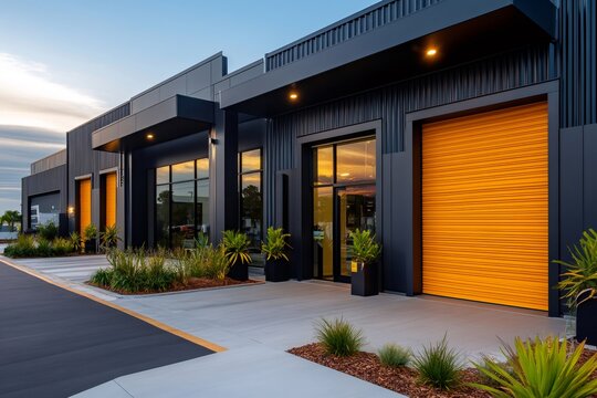Modern industrial units with striking orange roller doors at dusk