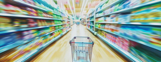 Blurred aisle in a grocery store, focus on shopping cart. Dynamic and modern style. Suitable for retail, commerce, and shopping. Generative AI
