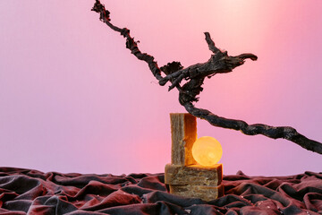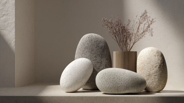 A serene composition showcases smooth, textured stones in varying shapes and sizes, complemented by dried foliage in a wooden vessel. Subtle shadows accentuate the natural forms
