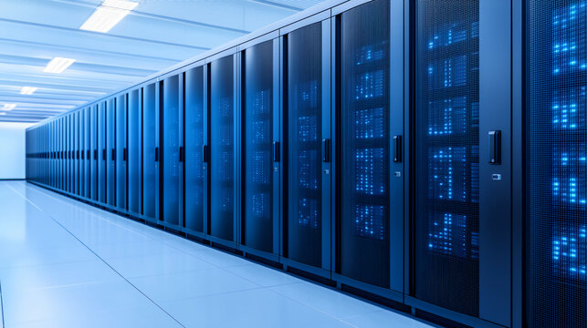Data center with rows of server racks under cool blue lights, a representation of modern digital infrastructure