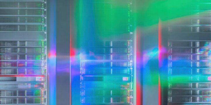 Digital servers in modern data center with light reflections