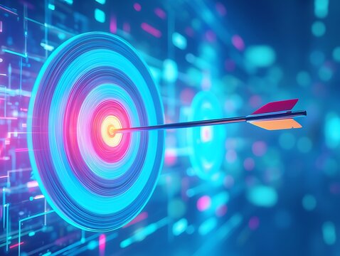 Futuristic dart hitting bullseye on digital target, glowing neon blue circles and data streams symbolize precision, success, strategy, innovation, business performance, and virtual technology concepts