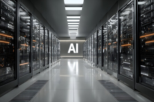 Inside a dynamic data center with a central AI sign, illustrating the role of artificial intelligence in enhancing data processing and storage solutions.