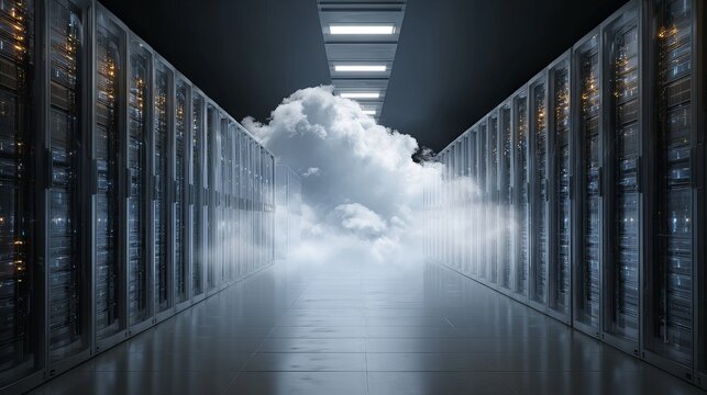 Futuristic data center hallway merging with ethereal clouds symbolizing seamless cloud computing integration and digital transformation innovation