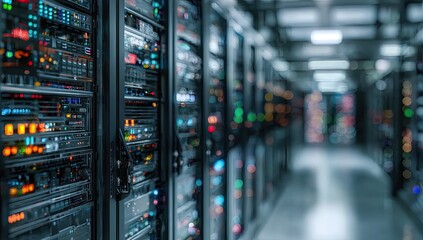 Long server room hallway with rows of network equipment and servers, a look into modern data center infrastructure