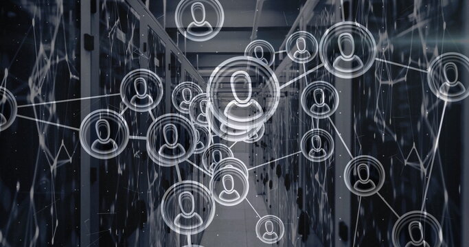Digital interface icons overlays on modern data center