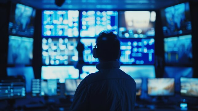Monitoring specialist overlooks a blue-illuminated tech environment, surrounded by complex displays in this control center of digital vigilance.