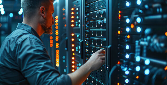 A person performing maintenance on a server rack, with indicator lights illuminated, inside a data center or technology lab during work.