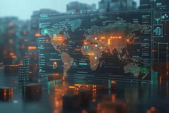Abstract digital world map with glowing data points and graphical user interface elements displayed