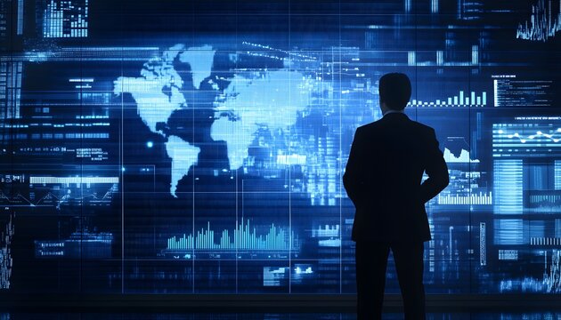 A Silhouetted Figure Observing Digital Data on a Large Screen