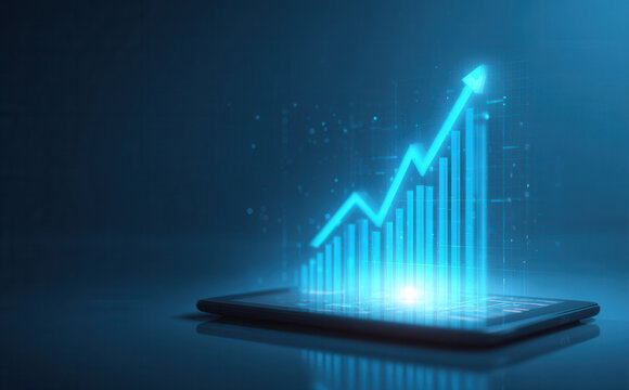 Digital tablet displaying glowing bar chart and upward trend line with blue technology light on dark grid background, symbolizing business growth success.