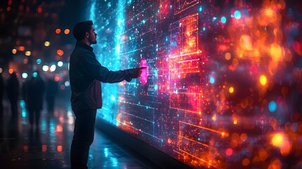 A businessman presents data visualizations on a large interactive screen, highlighting key insights and trends.