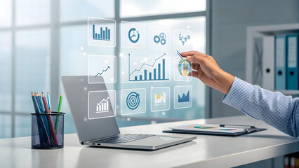 Futuristic digital dashboard with data visualization and analytics icons