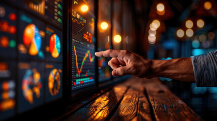 Interactive financial dashboard visualizing bar charts and line trends on futuristic grid