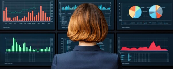 Digital dashboards featuring various glowing cyan charts and statistics displayed on dark rectangular screens.