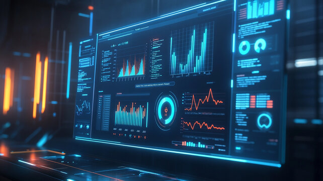 Futuristic sales dashboard with holographic charts displaying various data metrics and analytics. vibrant colors and sleek design create an engaging visual experience