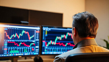 Digital dashboard displaying various stock market data and trends with orange and red lines illustrating fluctuations, observed in a modern workspace during the day.