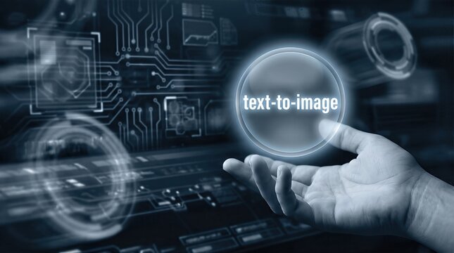 Hand reaching out to a glowing text-to-image interface, showcasing advanced artificial intelligence technology for image generation and creative assistance in a digital environment