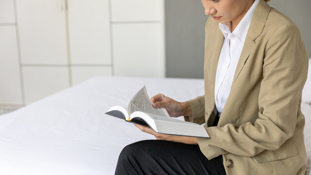 Young business lady in casual dress sitting on a clean white bed reading book to prepare for her business. Female worker reviews information from her notebook in an apartment