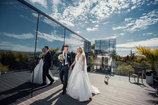 Wedding couple on the background of the modern city.
