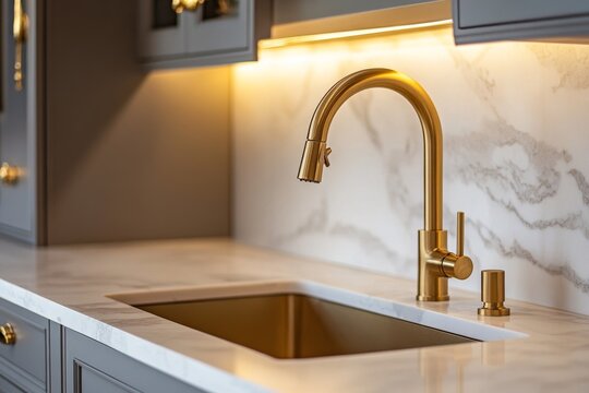 A sleek gold faucet is highlighted above a modern kitchen sink with a chic marble backsplash, showcasing an elegant design in a stylish home environment